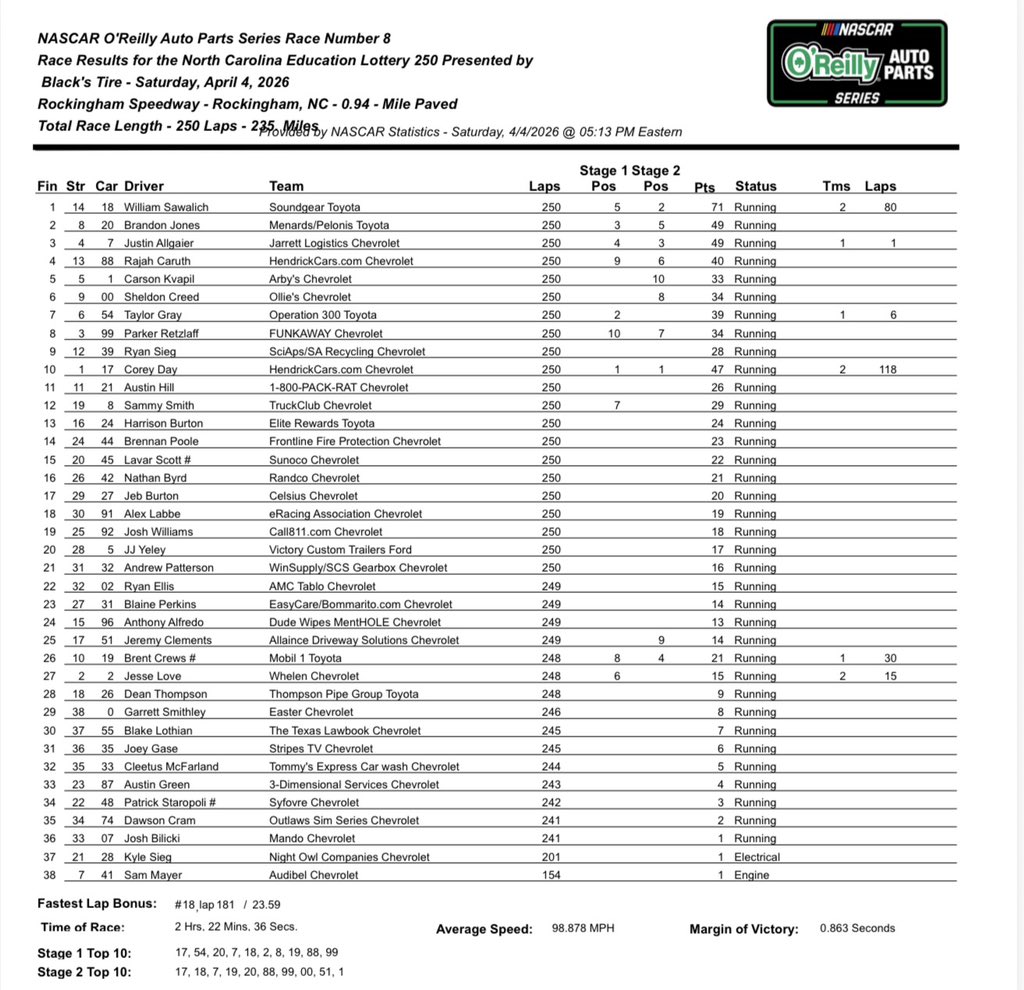 Unfortunately, the place and time was not this weekend at Rockingham Speedway at pit road woes put an abrupt end to his potential first career victory. But his loss was a gain for the Joe Gibbs Racing drivers as Brent Crews assumed the race lead. The 18-year old driver of the No. 19 Toyota 30 laps before faltering due to a flat tire. This blew the door wide open for his teammates, William Sawalich and Brandon Jones who took over the top 2 spots late in the going. Sawalich went on to score his first career victory in the NASCAR O’Reilly Auto Parts Series, putting an end to JR Motorsports 2026 win streak.