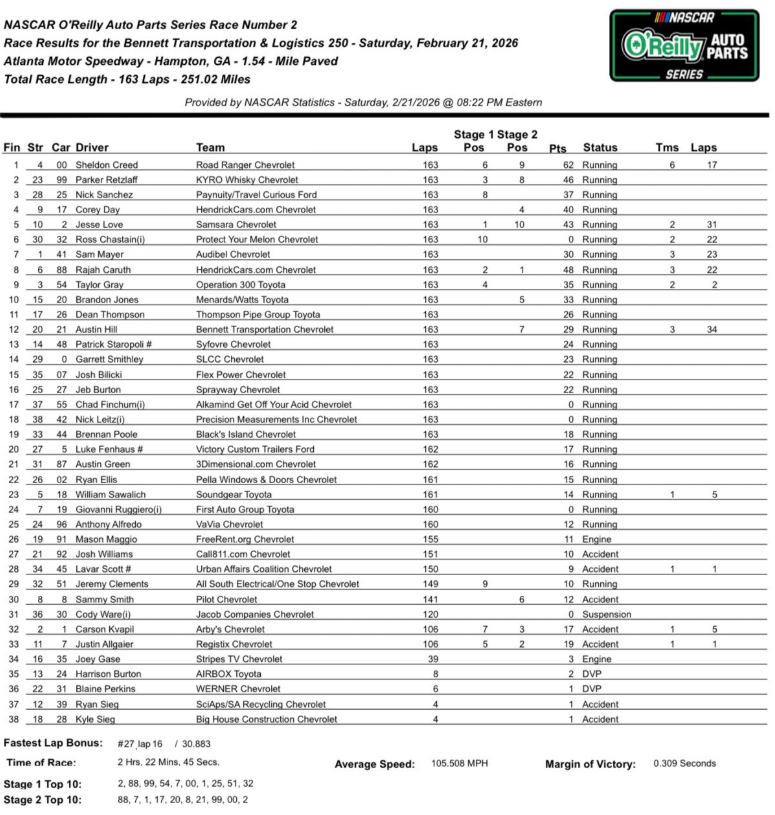 — NASCAR O’Reilly Auto Parts (@NASCAROReillyAP) February 22, 2026