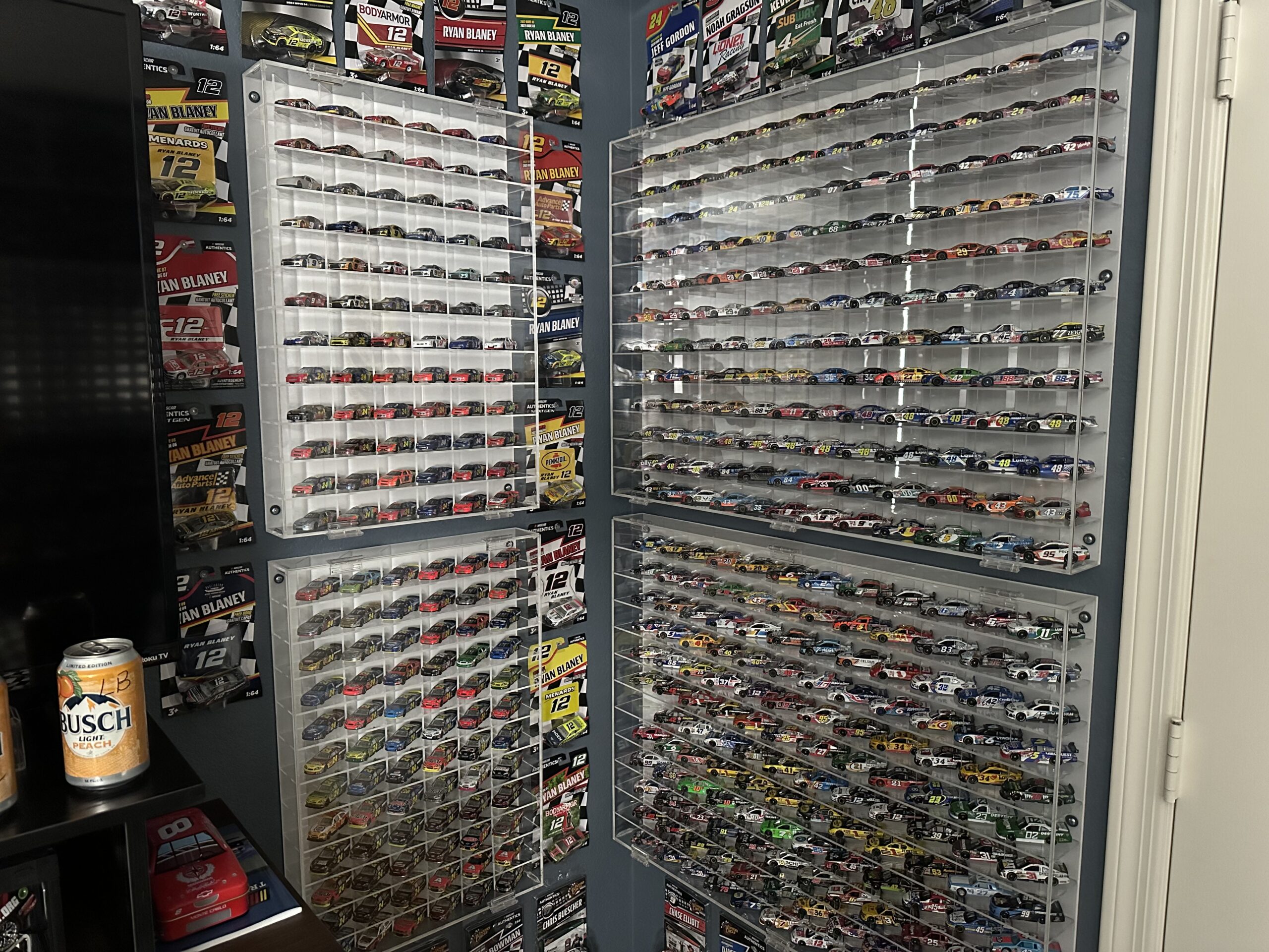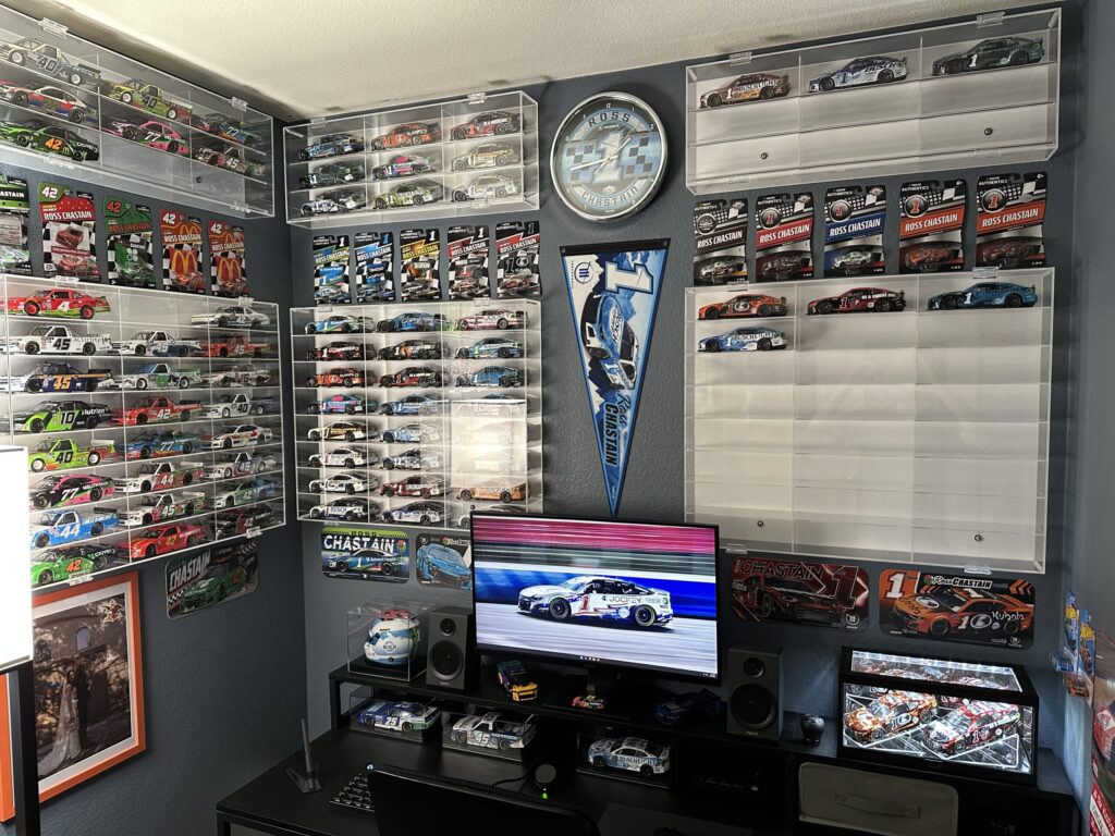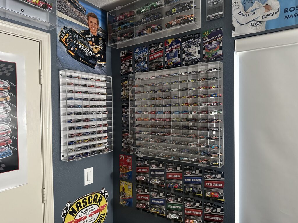 Nathan’s collection features a varied mixture of NASCAR memorabilia, some new and some old. These pieces are surrounded by more than 900 1:64-scale and 150 1:24-scale NASCAR die-casts displayed across the room’s walls. He says his collection took off in 2022, when a Ross Chastain die-cast gifted to him by his now-wife re-ignited his interest in the hobby.