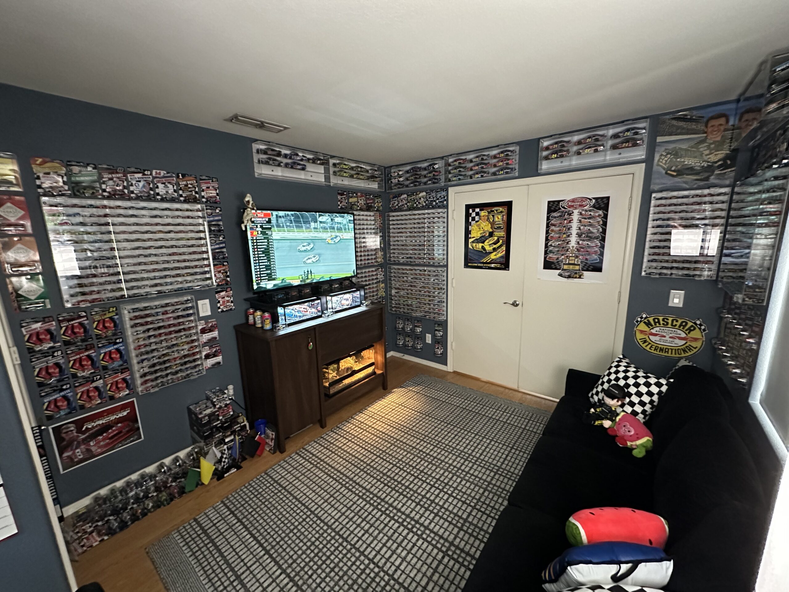 Each car is carefully positioned as this collection surrounds one of the cleanest race-day setups we’ve come across. The arrangement includes his TV surrounded by even more Chastain die-casts, including the now-iconic “Hail Melon” car the former watermelon farmer drove into the Championship Four in 2022.