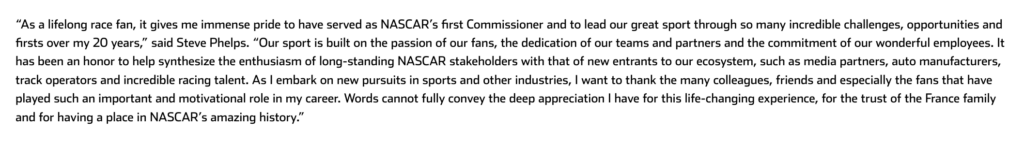 Despite his swift exit as Commissioner, Phelps’ time as NASCAR President, which came to an end earlier this year when Steve O’Donnell took over that role, will be remembered for several major moments and milestones for the sport.