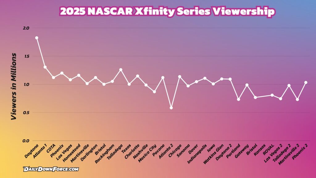 - There are two reminders about the Xfinity Series. First, there are occasions when 2024 viewership numbers or 2025 viewership statistics may not be available. Second, unlike FS1 or USA, the series’ former homes, the CW is a free, over-the-air network; this may contribute to a boost in viewership.