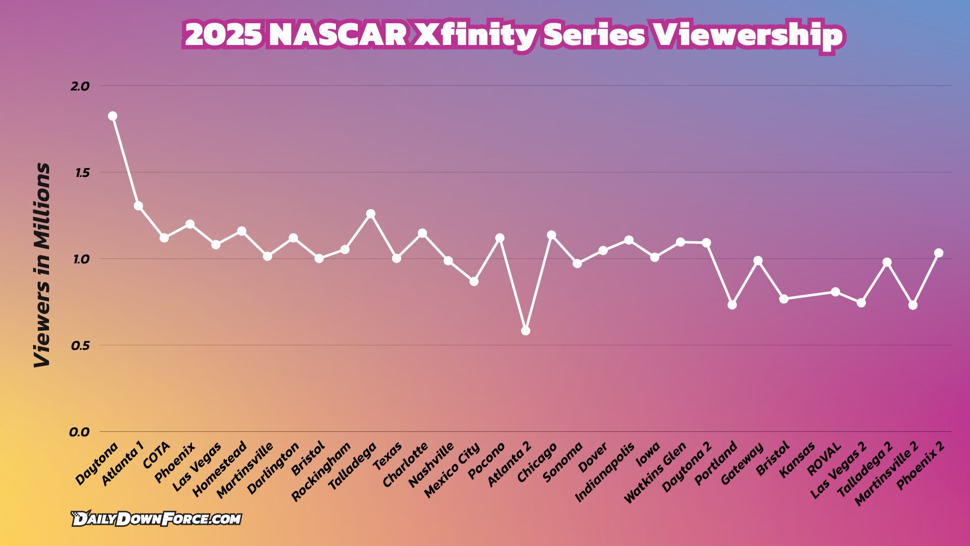 *NOTE: Race three of the 2024 Xfinity Series season was in Las Vegas and garnered 1.027 million viewers. This number will be used in the overall comparison.
