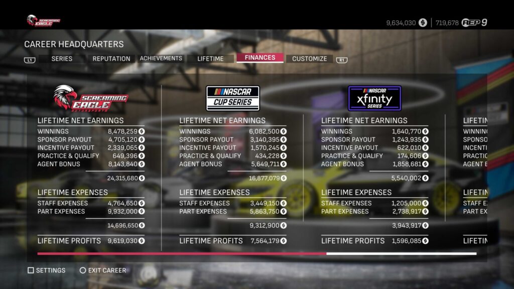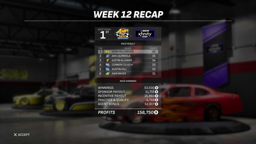 In NASCAR 25 Career Mode, money is used to both upgrade your car’s equipment and to hire new staff. We’ll talk in more detail about those two systems later, but for now let’s look at where money comes from.