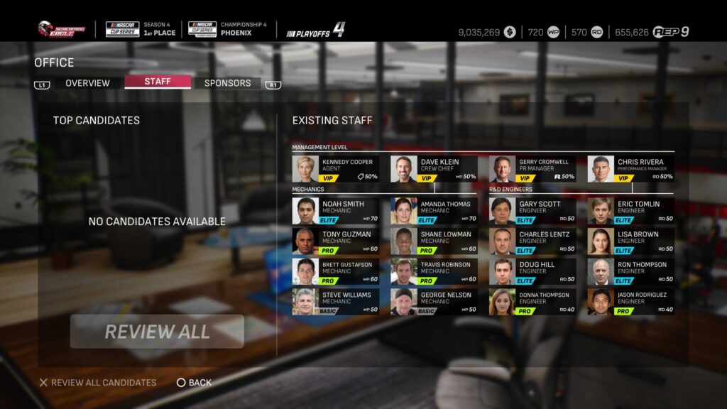 The most important thing to know about your staff is that you must manually check for them between every race. There will be no notification or message telling you that new candidates are available. Just make it part of your routine that you check the employees page every single time you come back to your race shop. Everything else will notify you, but not employees.