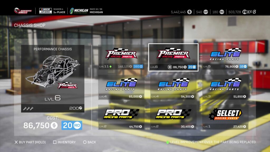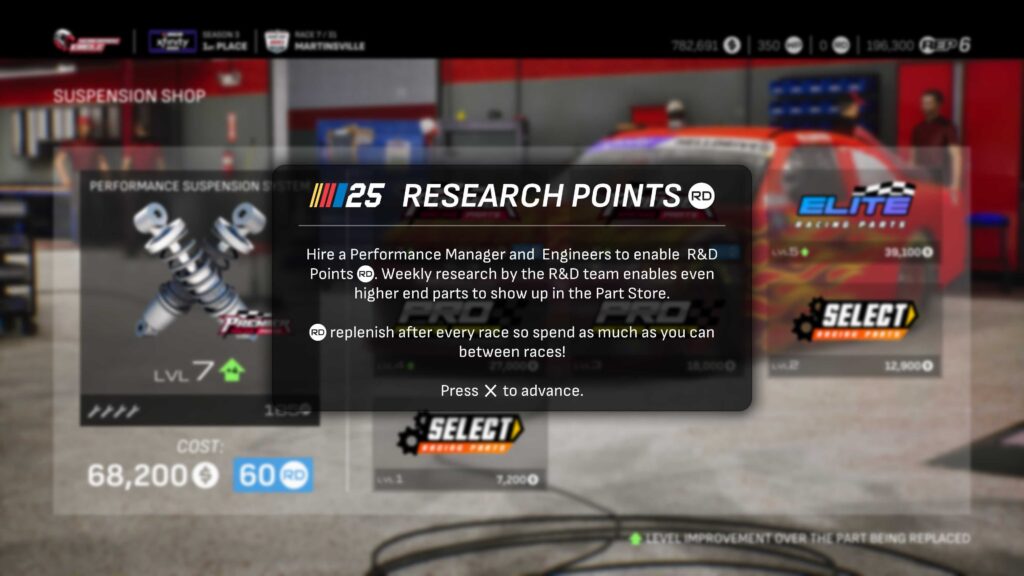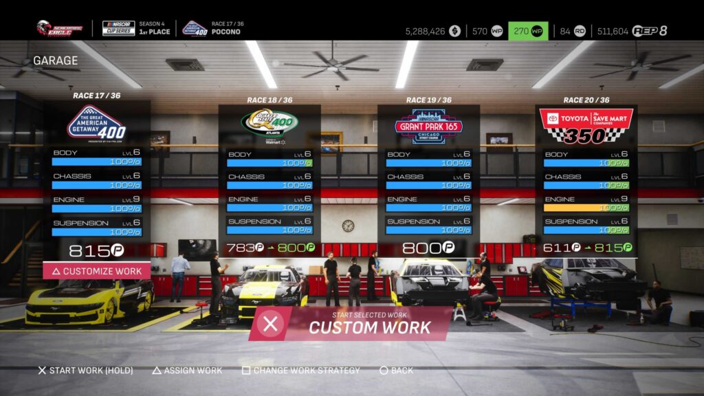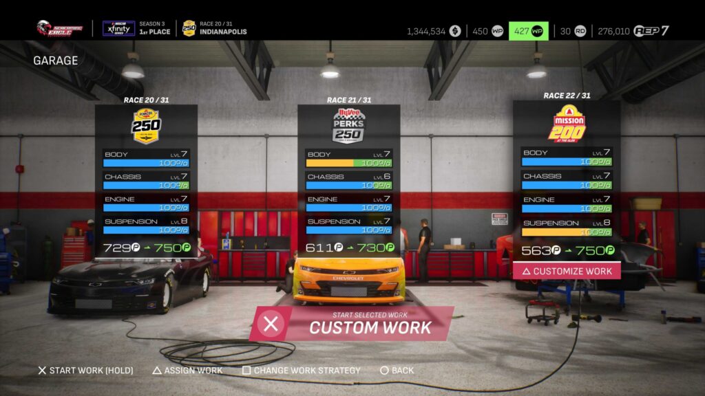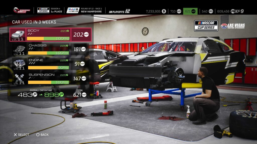 NASCAR 25 Career Mode gives you the option to upgrade your car and repair it after each race. Upgrades cost money (and later on, money + RD), while repairs cost WP.