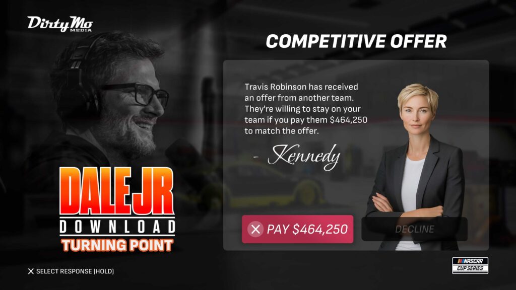 Through the course of NASCAR 25’s Career Mode, you’ll occasionally be offered choices. These will come from your Agent employee semi-regularly, and very rarely from cutscenes featuring in-universe episodes of the Dale Jr. Download.