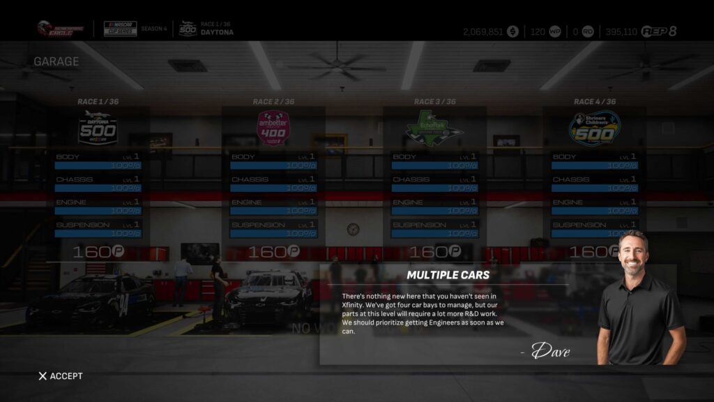 You will start your ARCA career with one car, then increase as you move up. You’ll swap between two trucks in the Truck Series, three cars in the Xfinity Series, and four cars in the Cup Series. Which specific car you use for each race is determined automatically by rotation, you cannot choose to favor one car or even use it twice in a row.