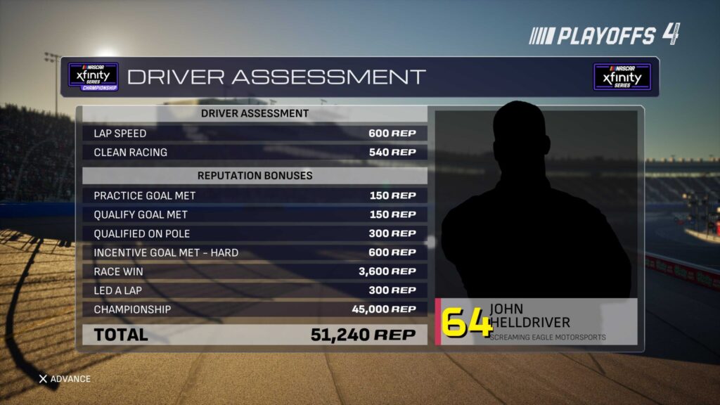 The smallest amount of Reputation will come from Practice and Qualifying, while the largest will come from winning the race and meeting your sponsorship incentive goals. Therefore if you’re going to skimp out on anything, you can feel free to breeze through or even skip the first couple sessions (Practice and Qualifying) and get right to racing without fear of holding yourself back too much in experience gain.