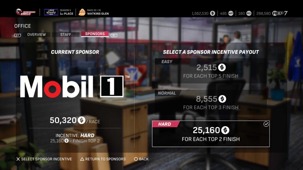 As mentioned, sponsors will become available as you hit certain breakpoints on your Reputation meter. The sponsors offer incentives based on your finish in each race, and as you progress through various sponsors, their incentives will gradually increment upwards. Your first sponsors in ARCA may offer only a few grand for meeting their requirements, while your last few in the Cup Series will be rewarding $150,000 or more.