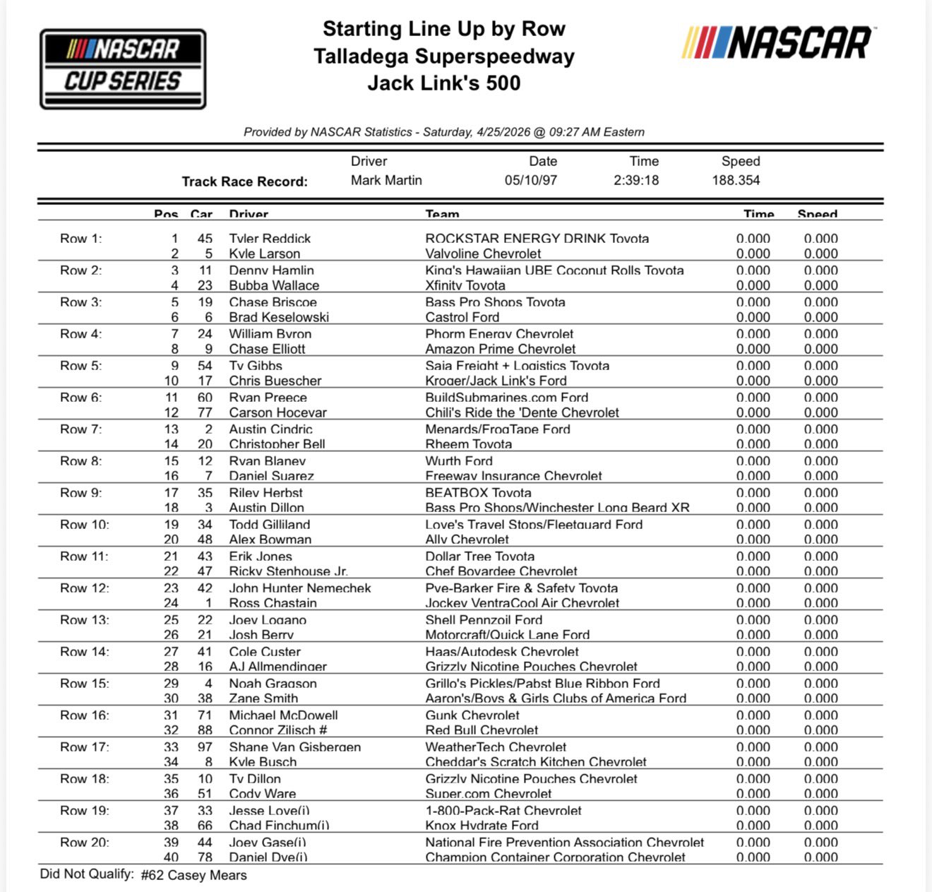 - Due to qualifying being rained out, the Beard Motorsports once again missed the race. Casey Mears was scheduled to drive their No. 62 Chevy. Meanwhile, Daniel Dye will make his NASCAR Cup Series debut in the Live Fast Motorsports No. 78 Chevy. He rounds out the 40-car field.