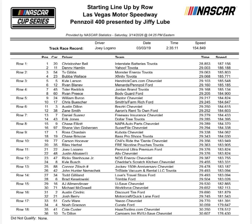 - The big storyline heading into today is just how fast the Toyotas have fired off this season. They won the first three races in a row with Tyler Reddick. Now, in Vegas, they claim the first four starting spots with Christopher Bell and Ty Gibbs claiming the first row. It is Bell’s fourth pole at the track but he has yet to cash in and win in Sin City. His best finish at the track is a pair of 2nd places, which he earned in 2023 and 2024 respectively. In the fall 2025 race at the track, he finished 3rd. Could today be his day?