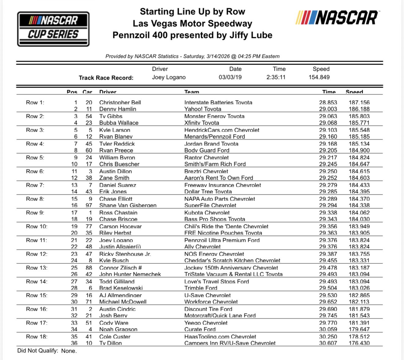 - Defending race winner, Josh Berry, had a shockingly slow qualifying time. After a lot of promise to start the year, he’ll be rolling off the grid today in the 32nd position. He’ll have a lot of work in front of him if he wants to defend his win.