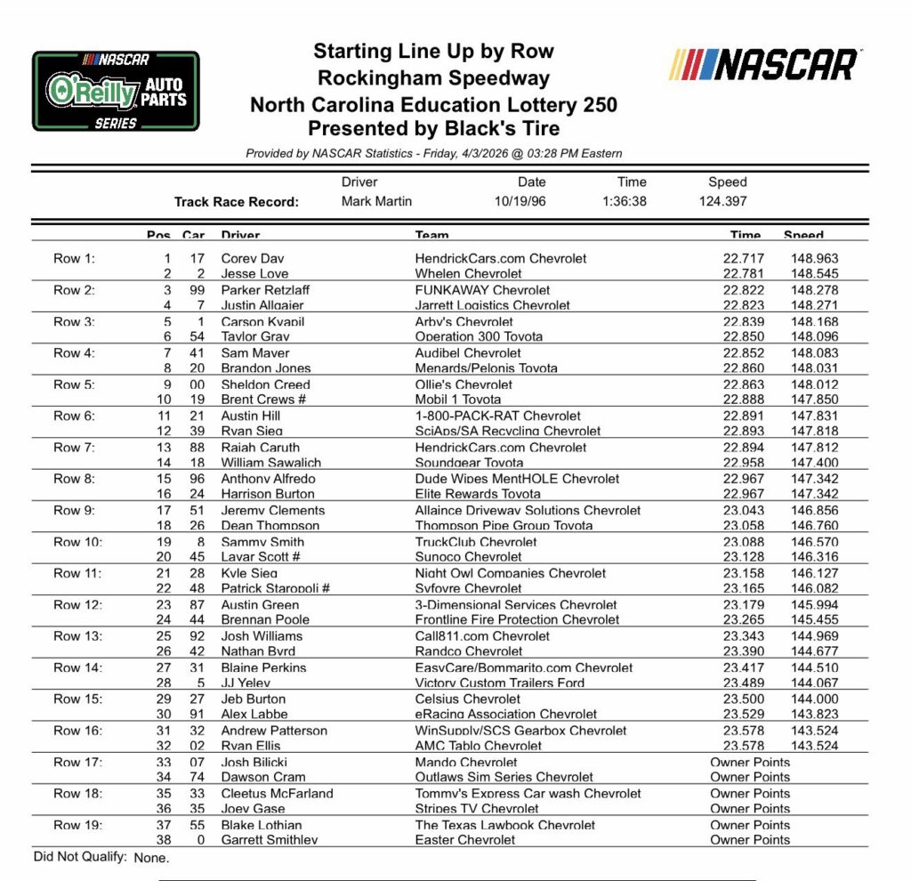 With the NASCAR Cup Series having the weekend off, it’s the stars of tomorrow, the greats of the NASCAR O’Reilly Auto Parts Series, who are taking center stage for a Saturday afternoon showdown on this Easter weekend at the famous Rockingham Speedway. Some of these drivers have never seen this track in their lives. For some, it’s the second time around. Last year’s race had many things. The return of Kasey Khane. A controversial finish which saw Jesse Love get disqualified, and Sammy Smith walk off with the win. What’s in store for us today? Here’s what you need to keep an eye on in today’s North Carolina Education Lottery 250 at the historic Rock.