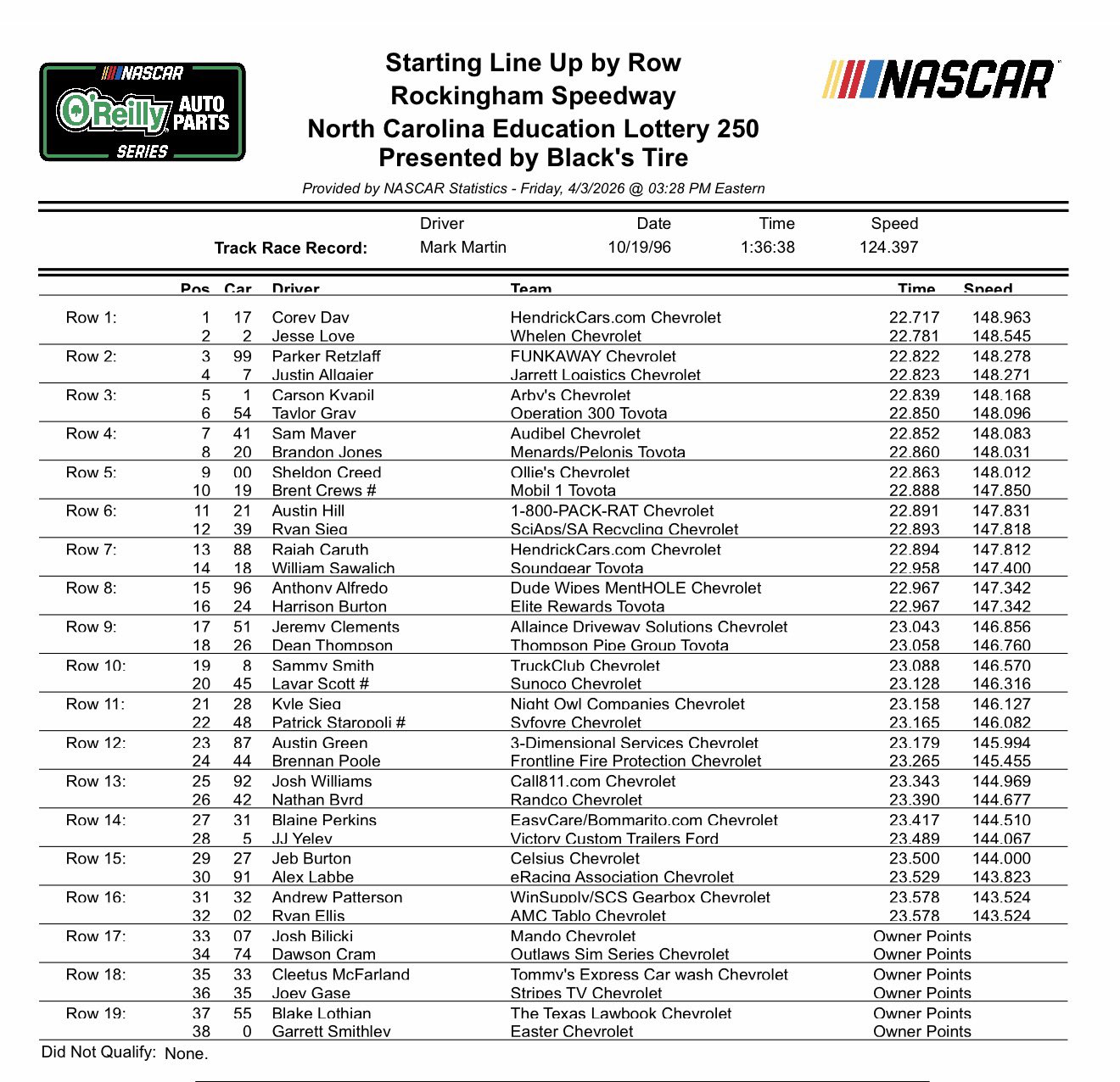 - Corey Day captured his first pole award in his first trip to the Rock with a time of 22.717. Having cleaned up his act in recent weeks, and earning 6 top 10 finishes in the first 7 races of the 2026 season, including a 2nd place finish last week at Martinsville, many fans are wondering if today could be the day that he shatters the glass ceiling and captures that first elusive OAPS race win. He’s off to a great start as he will lead the field to the green this afternoon.