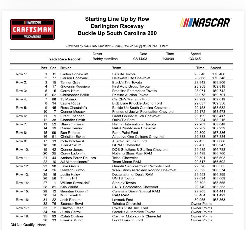 The NASCAR Craftsman Truck Series is back in action under the lights at the historic Darlington Raceway. Though throwback weekend is no longer “official”, the tradition at the Lady in Black continues. Up first to wet our palates: the Buckle Up South Carolina 200. Here’s what you need to keep an eye out for in tonight’s race.