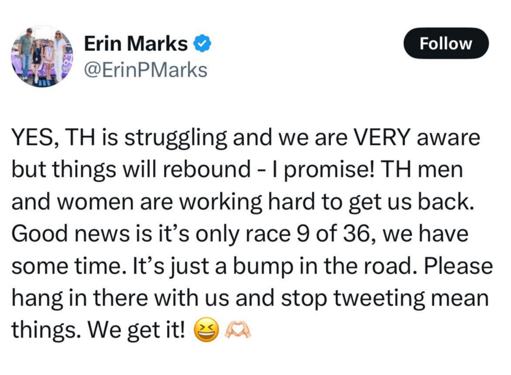 But as the results have dipped, so too has the tone of the conversation around the team. Fans and media have weighed in, and not all of it has been easy to digest. Erin Marks responded to the chatter with a post on X, offering both a reality check and a plea for patience.